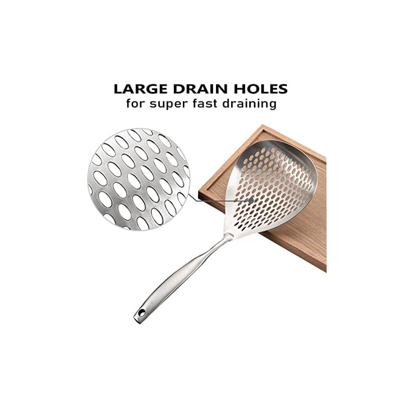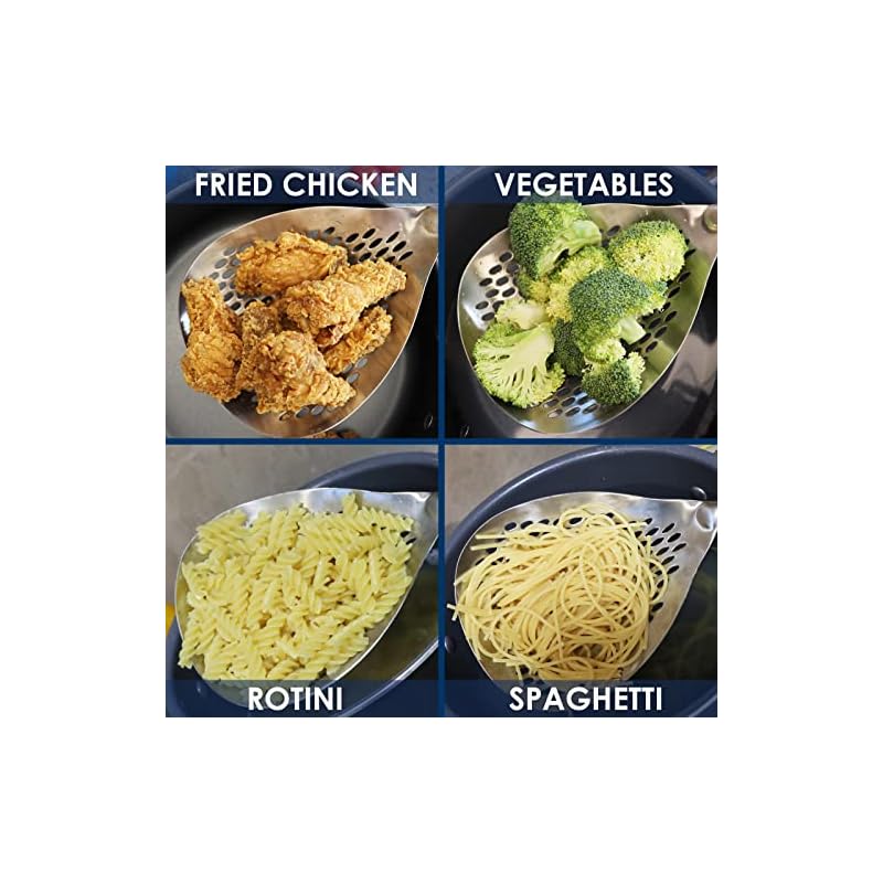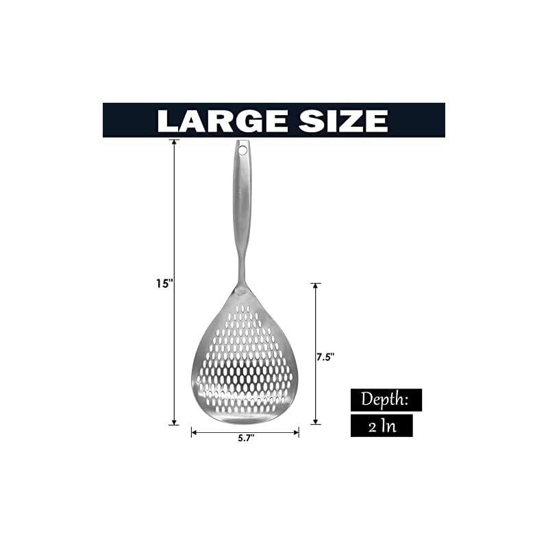 LARGE STRAINER BOWL – The whole length is 15 inches, width of the bowl is 5.7 inches and depth is 2 inches. The extra-large strainer bowl helps you quickly scoop out a considerable amount of food in seconds without scalding your hands. It’ll be widely used in your kitchen, and it’s an essential item in the process of cooking and frying food at home or in restaurants.