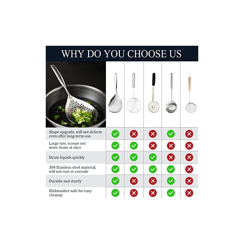 LARGE STRAINER BOWL – The whole length is 15 inches, width of the bowl is 5.7 inches and depth is 2 inches. The extra-large strainer bowl helps you quickly scoop out a large amount of food in seconds without scalding your hands. It will be widely used in your kitchen, and it’s an essential item in the process of cooking and frying food at home or in restaurants.