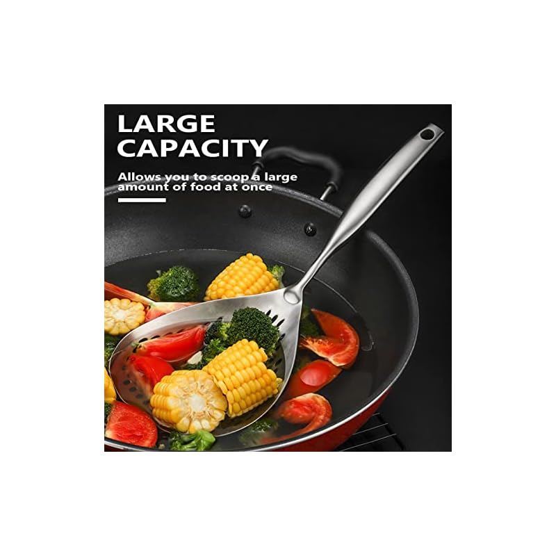 QUICK TO DRAIN – Uniform oval holes design of the slotted spoon maintains the maximum speed of draining, can be used for draining a variety of food in deep frying and cooking. Oval holes in the strainer bowl make draining quick without your food slipping through during cooking. It can even be used for cleaning vegetables and fruits.