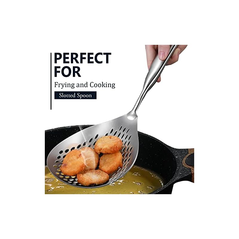 PERFECT FOR DEEP FRYING AND COOKING – This skimmer slotted spoon is crafted of 18/8 stainless steel and ergonomically shaped for excellent balance and regulate – for a difference you’ll be able to actually feel in the hand. It’s ideal for deep-frying, sautéing, stir-frying and wok cooking. Perfect for frying foods, like potato chips, French fries, fried chicken, and scooping up poached eggs, vegetables, noodles, pasta, wonton and more.