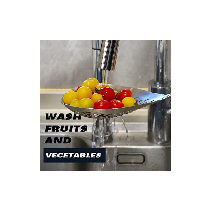 QUICK TO DRAIN – Uniform oval holes design of the slotted spoon maintains the maximum speed of draining, can be used for draining quite a few food in deep frying and cooking. Oval holes in the strainer bowl make draining quick without your food slipping through all the way through cooking. It can even be used for cleaning vegetables and fruits.